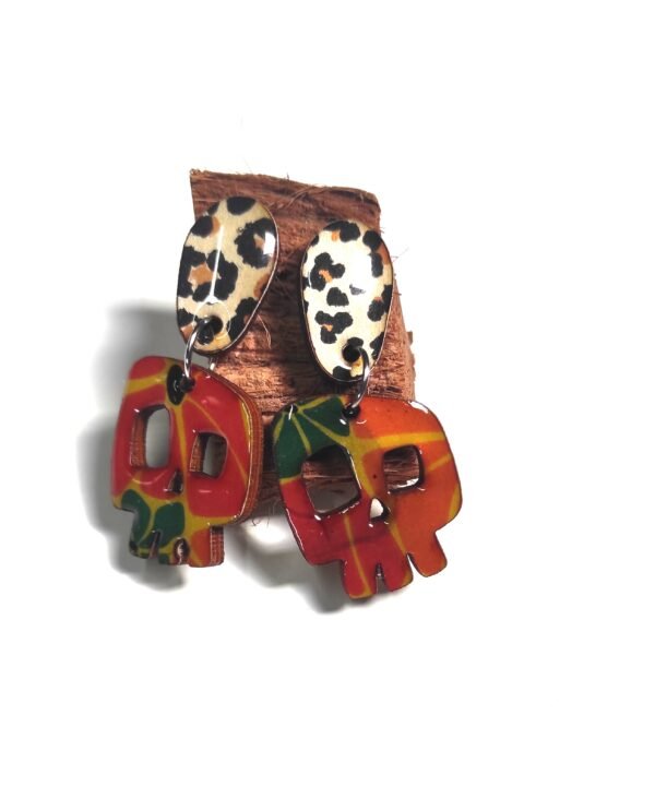 Pendientes de madera con forma de calavera y estampado en tonos naranja 🍊🧡