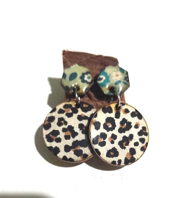 Pendientes de madera con forma redonda y estampado de leopardo combinado con estampado floral en tonos verdes🐆🌼